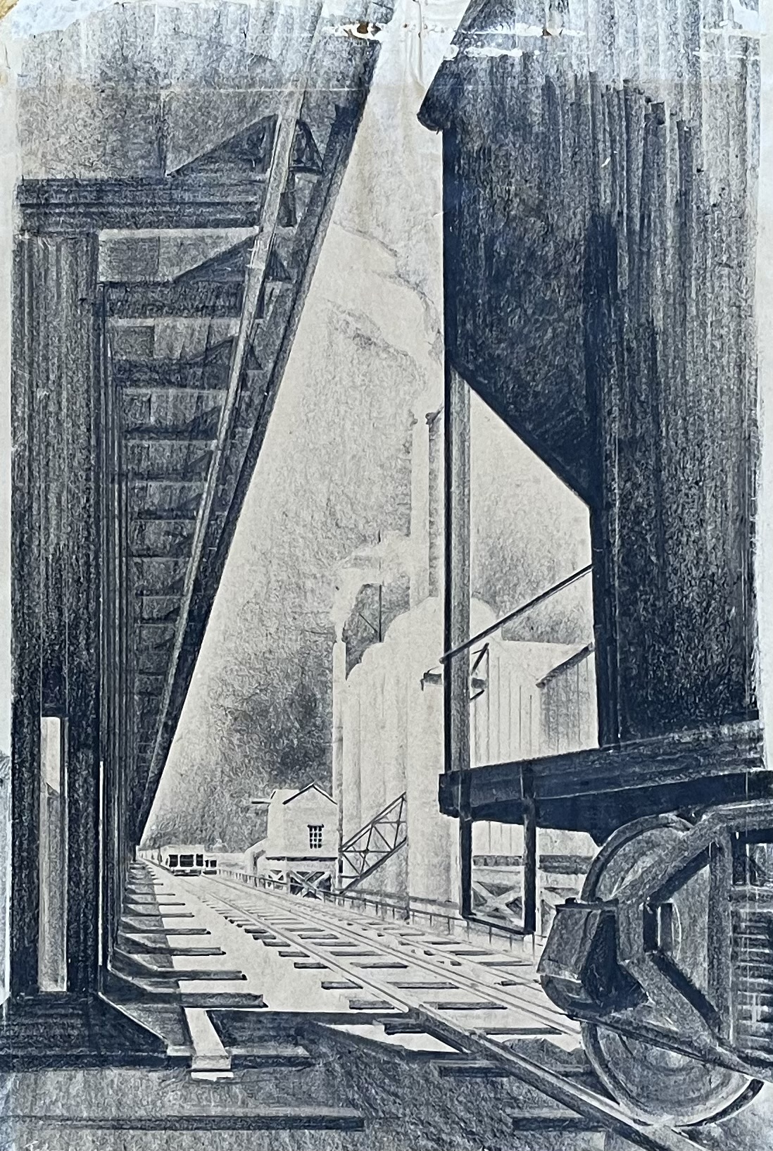 signed B&W ink (charcoal ?) 13 x 19 drawing on waxy paper of graphic angle of a railroad car at a grain elevator John Noble Richards signed left bottom corner. NOW UNFRAMED JOHN NOBLE RICHARDS(1904-?) Born 1904 in Warren, Ohio, John Noble Richards studied architecture at the University of Pennsylvania, where in 1928, he was awarded the Paul Cret Medal for Excellence in Architectural Design. Later, he was also awarded the Stewardson European Traveling Scholarship. Richards was affiliated with the architecture offices of Edwin Brumbaugh and Zantzinger, Borie & Medary in Philadelphia before moving to Toledo, Ohio in 1932. In 1940, he became partner in the firm of Bellman, Gillett and Richards. His many projects included the Ohio State University Student Union and Mershon Auditorium, the Masonic Complex in Toledo, and the Ohio Bell Telephone Company Cherry Center Office in Toledo. He served in many civic leadership positions, including mayor of the village of Ottawa Hills, member of Toledo’s Metroplitian Planning Commision, and from 1958 to 1960, as President of the national AIA.