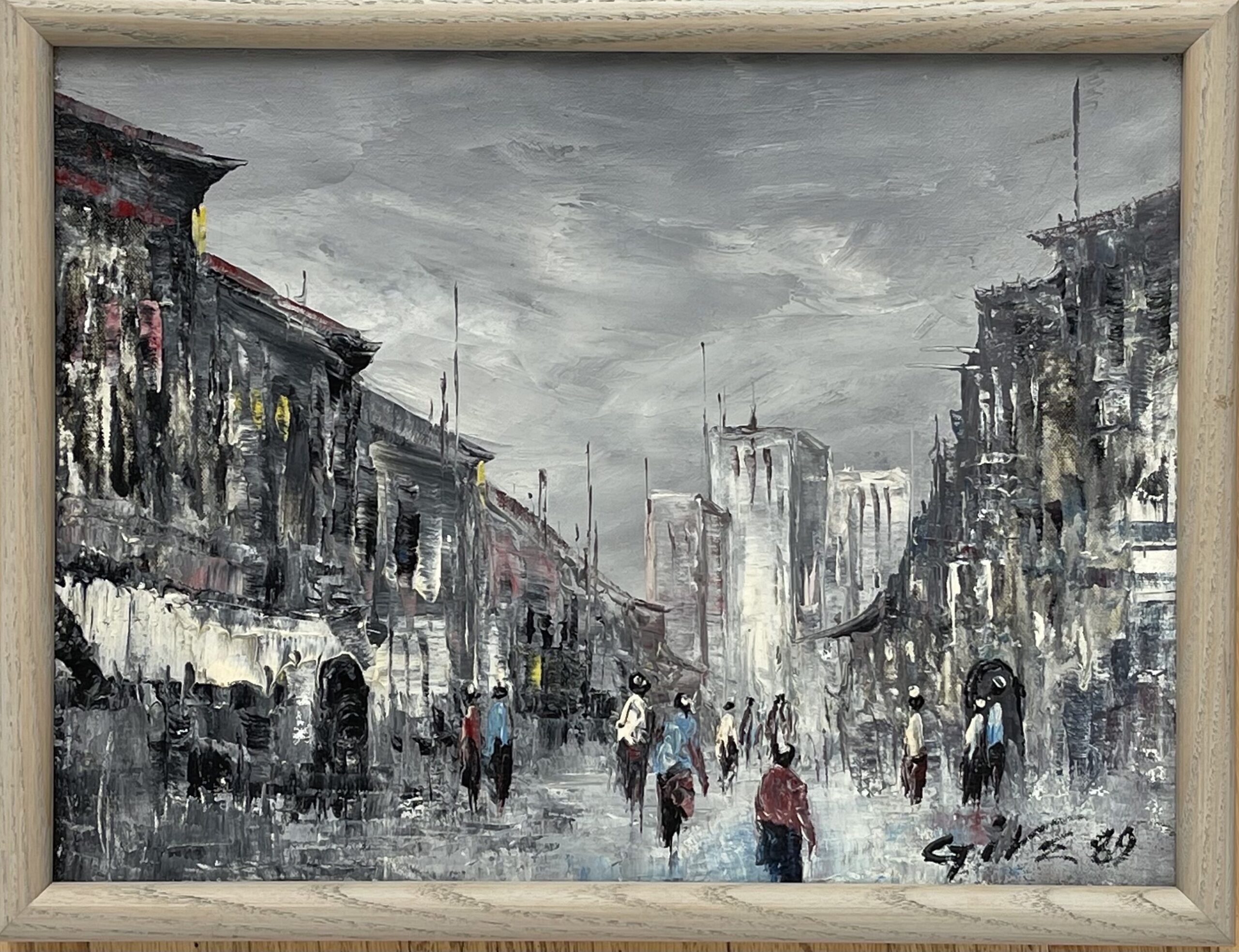 11.5 x 15.5 original acrylic/oil? of city scene Papa New Guinea (Port Moresby?) – city street scene signed C tive (Give?) 89 Bought by former own from local artist