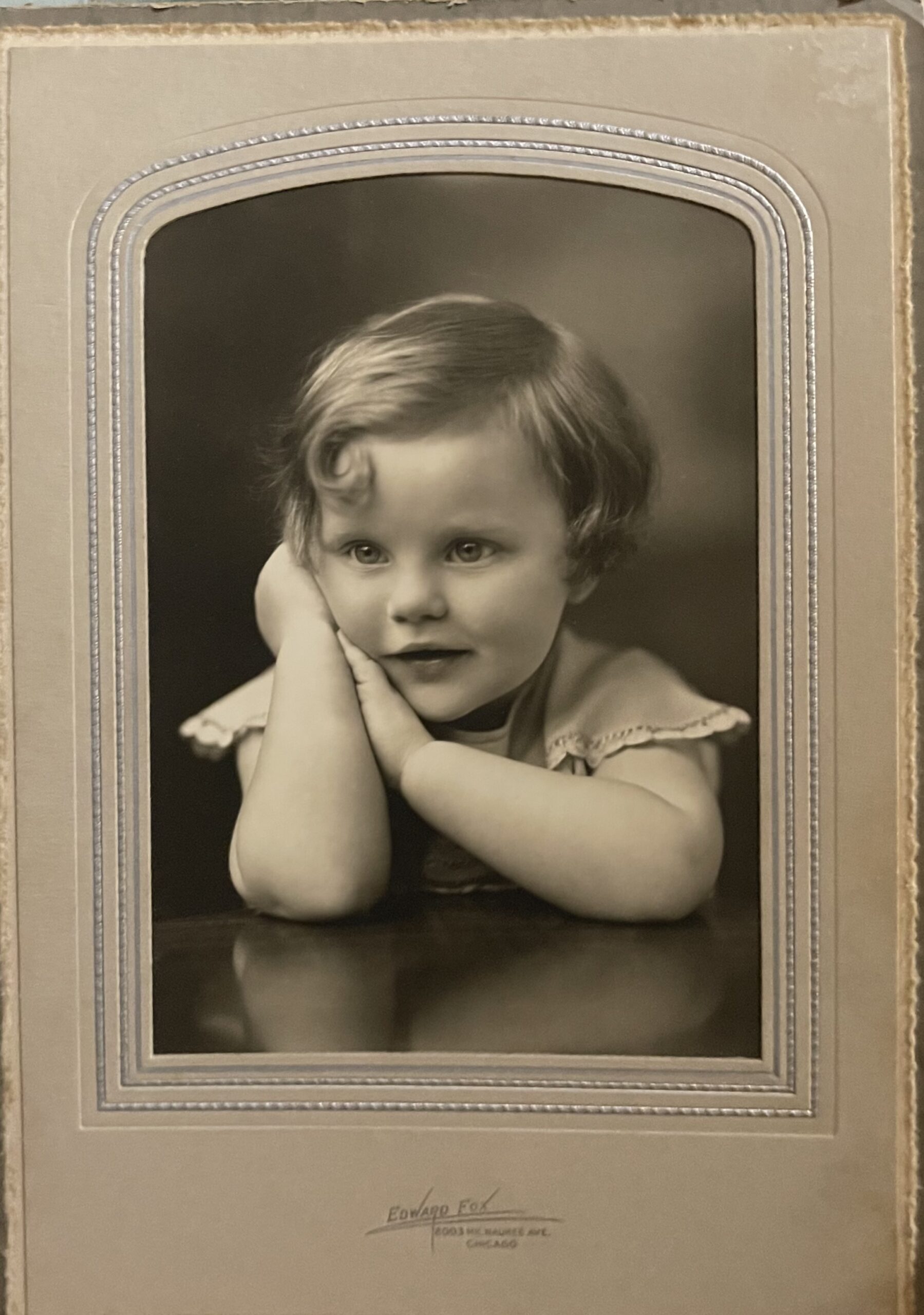 Visual Description: B&W photo in deco frame little girl beautiful studio portrait with curl on forehead and hands on face