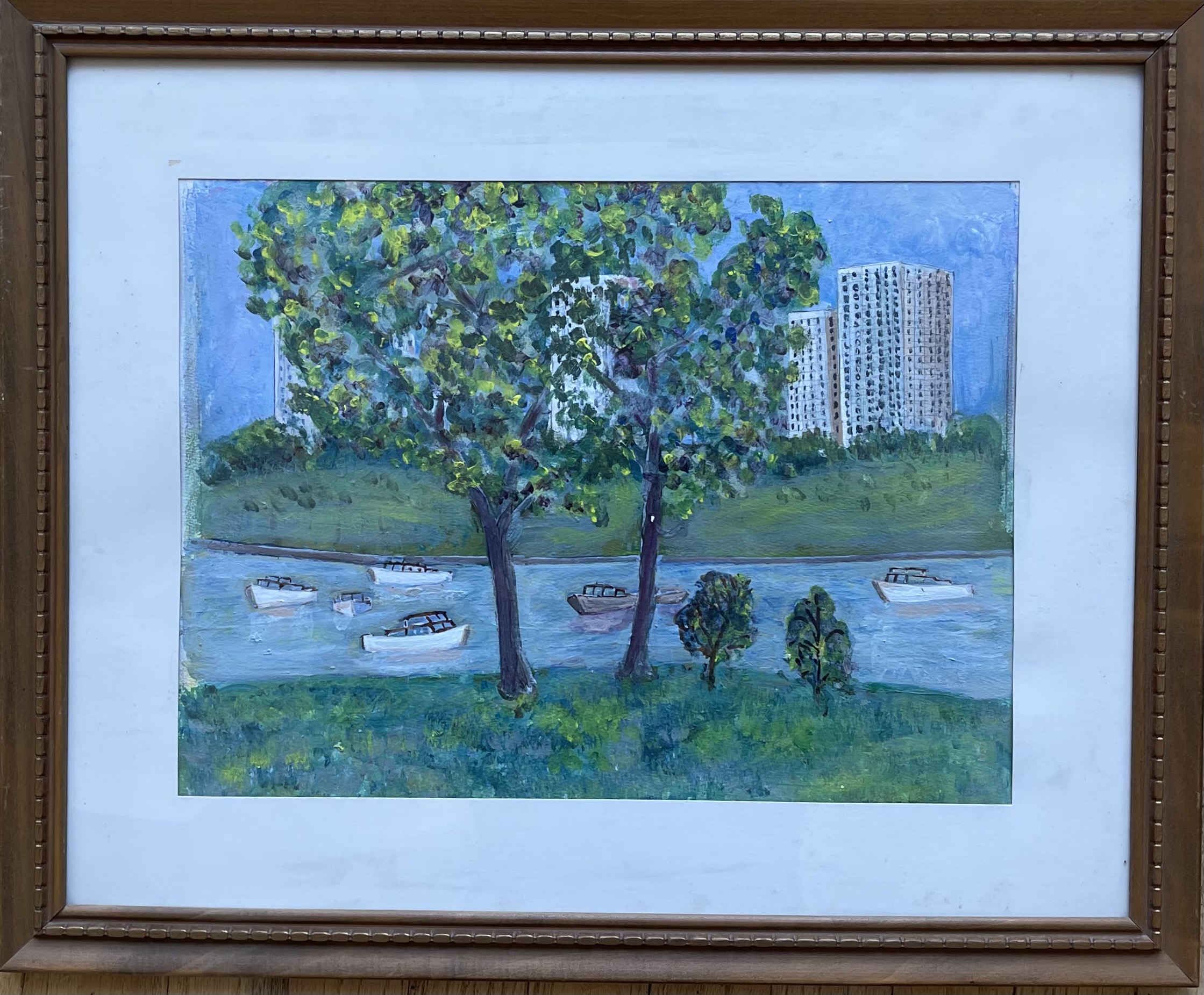 11.5 x 15 Possibly Vivian Springer although unsigned little boats on a river with building in background and two large trees in foreground