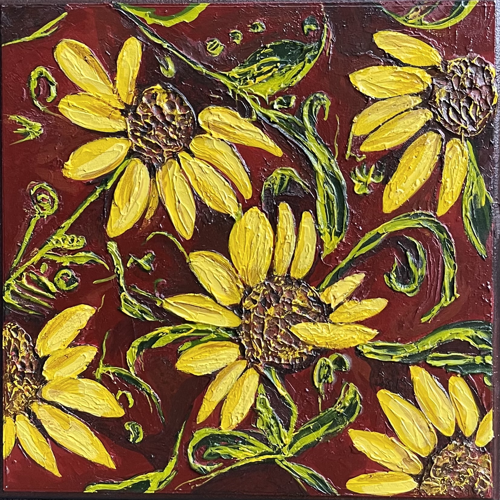 12 x 12 acrylic on board of sunflowers by Pam Veitenheimer signed & dated 5/2011 on back