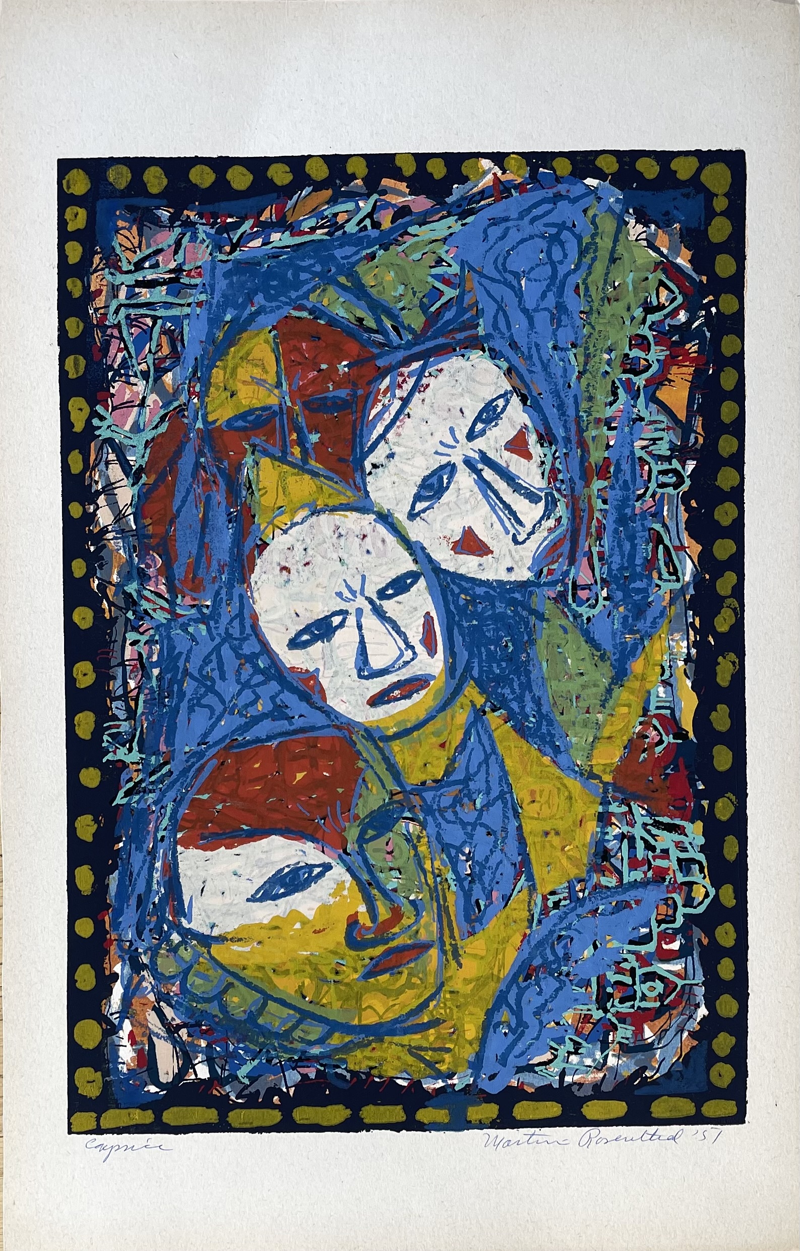 11 x 15.5 Martin Rosenthal Serigraph Caprise 51 signed & dated "Caprice", A limited edition serigraph by the Woburn Massachusetts-born, well-regarded modernist artist Martin Rosenthal (1899-1974). It is titled in the bottom margin, lower left, and signed lower right. It measures 20" by 13". It is un-blemished. clean, but neither framed nor mounted. - cuRAYtor Art