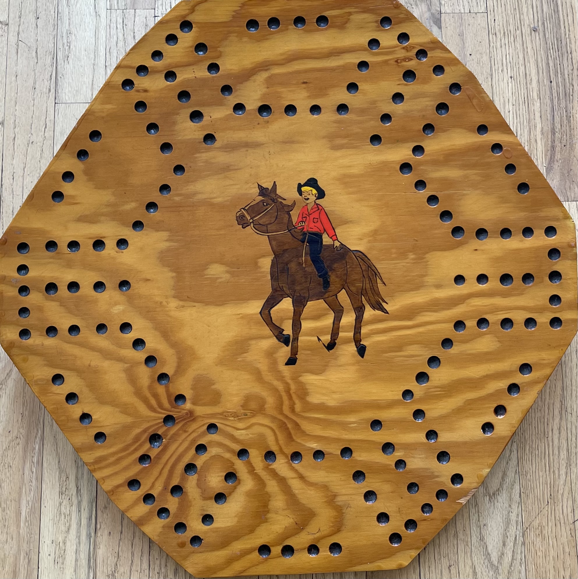 handmade double sided wooden marble game board, hand painted smurfs on one side, cowboy on horse on other side
