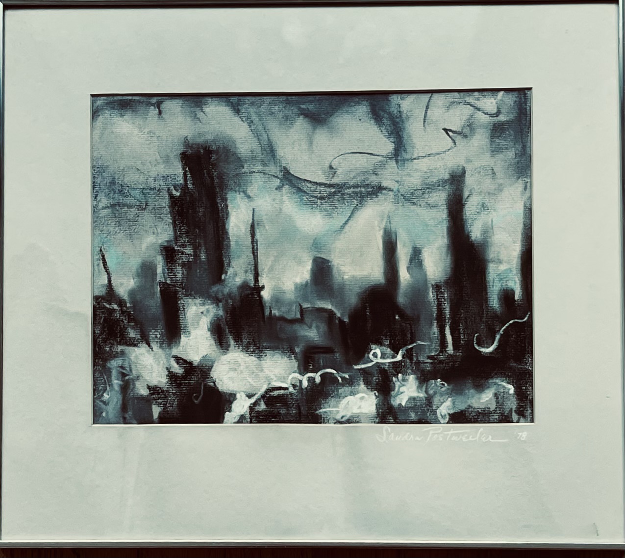 11 3/8 x 11 1/2 pastel – abstract chicago skyline Chicago morning (from Kennedy) on verso. signed on front Sandra Postweiler. Sticker on back Wilmette, IL