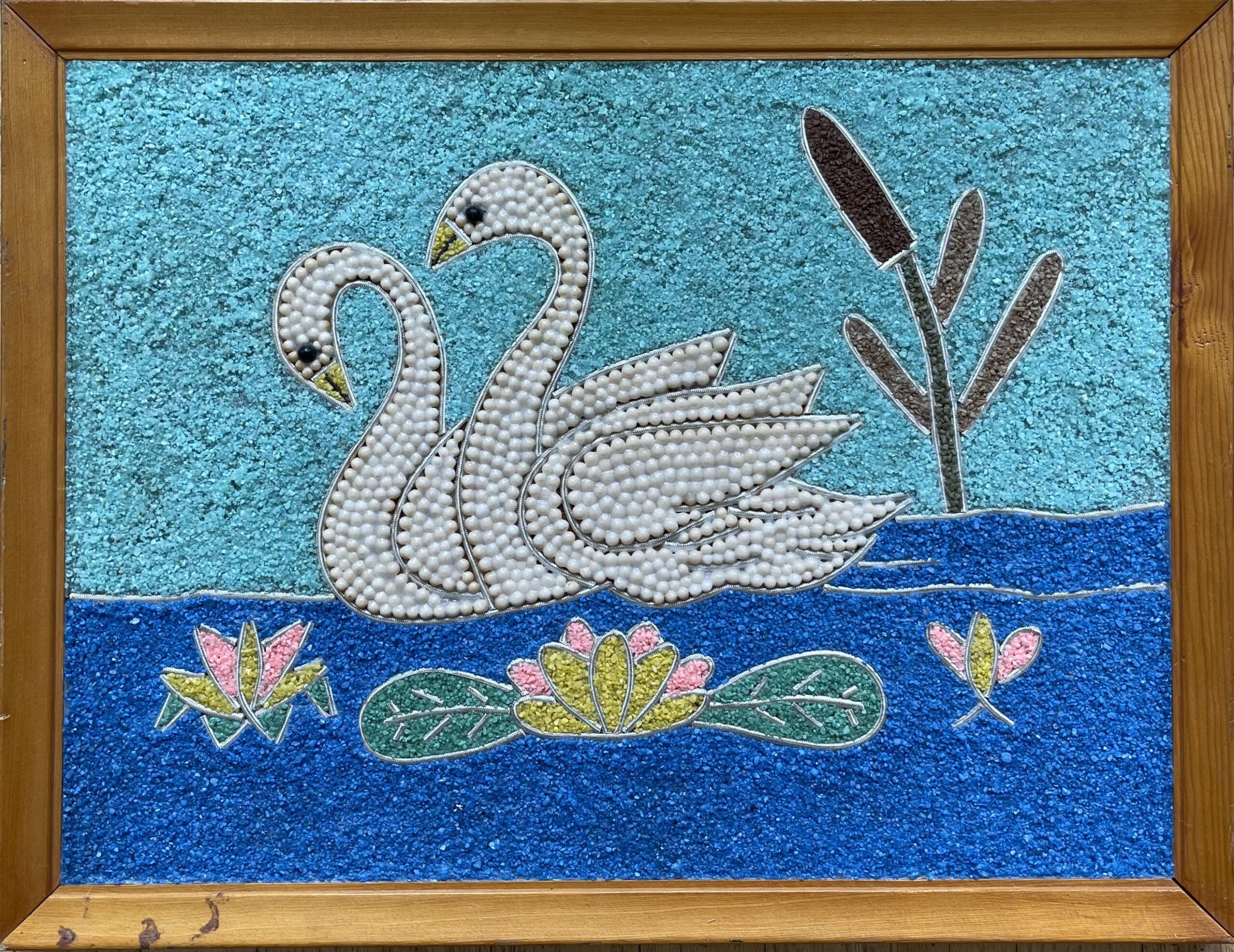 outsider art rock assemblage on plywood of two swans on lake with cattail 14.5 x 19.5
