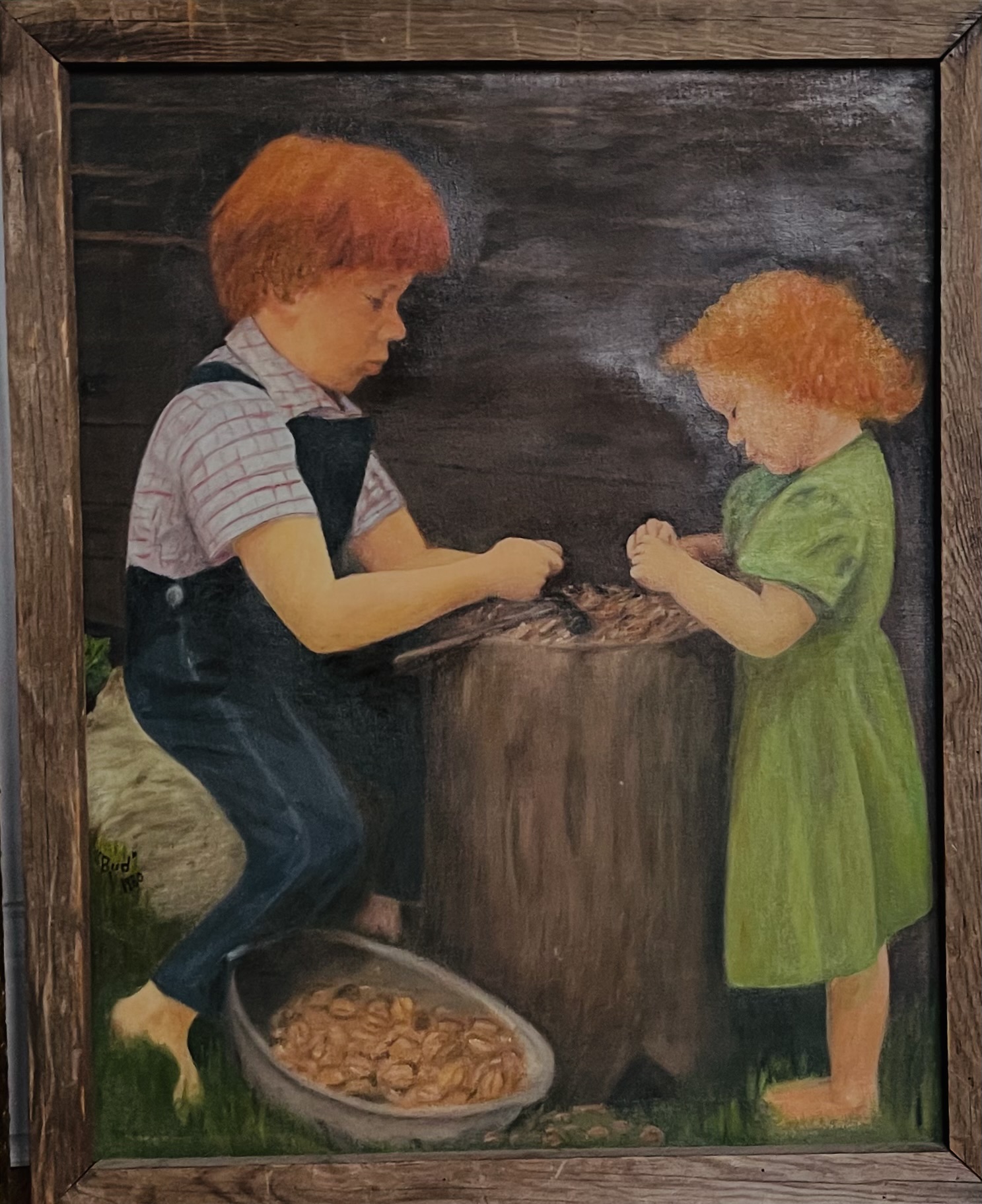 Visual Description: Two red headed kids, boy & girl shelling pecans on a tree section