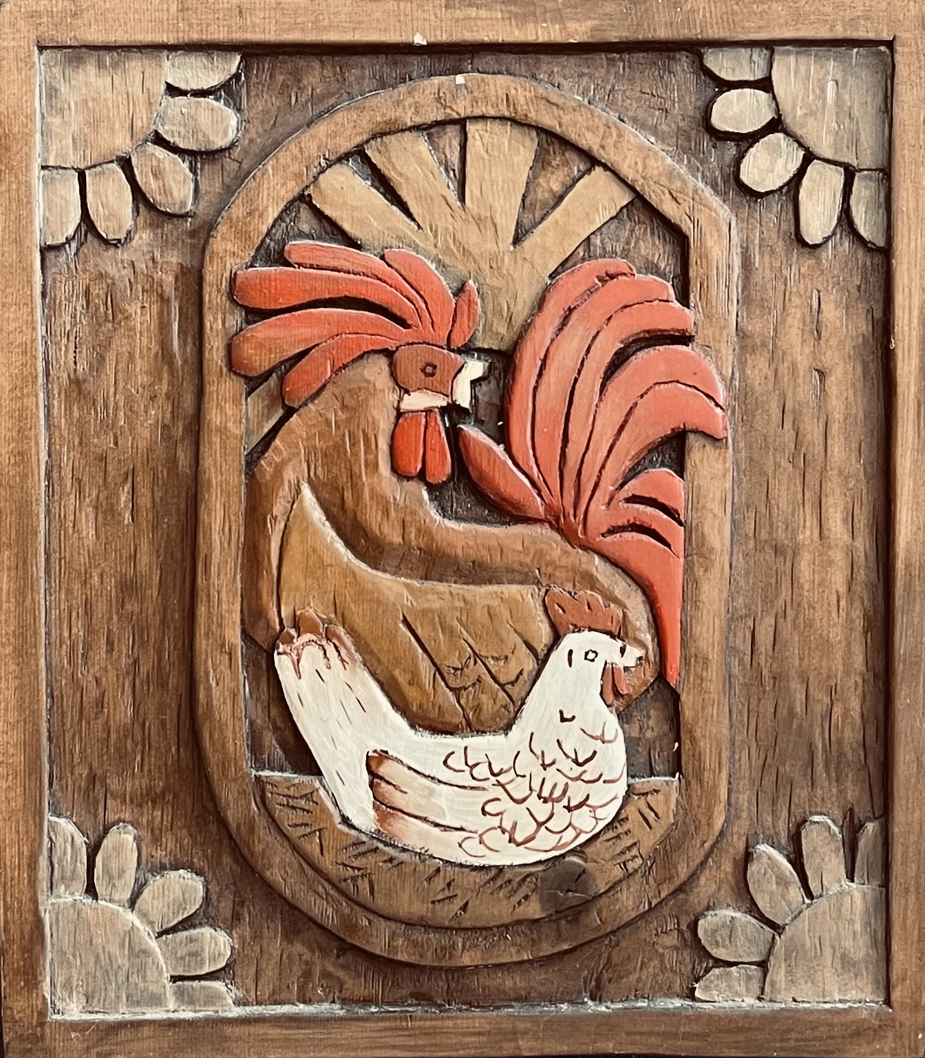 hand carved 9.25 x 11 wood carving hangings of chickens – some parts painted. On back: Made by Rosalie A. Trudell March 1985 Cumberland Wic
