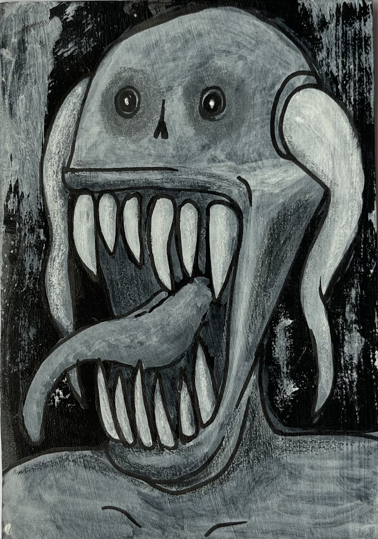 Visual Description: B&W large mouth creature with large teeth and drooping horns