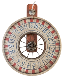 [FOLK ART CARNIVAL ARTIFACTS] Hand-painted gaming wheel. Double sided small wheel with metal pins and plastic clapper. Wheel is mounted onto wooden crossbar. Center wheel appears to be from a laundry cart. 14 ½ “ in diameter. Overall: 19 h x 14 ½ w x 5”d. Wheel is worn with age and use, leather clapper is likewise worn, wheel spins easily. A very good example of homemade gambling apparatus.