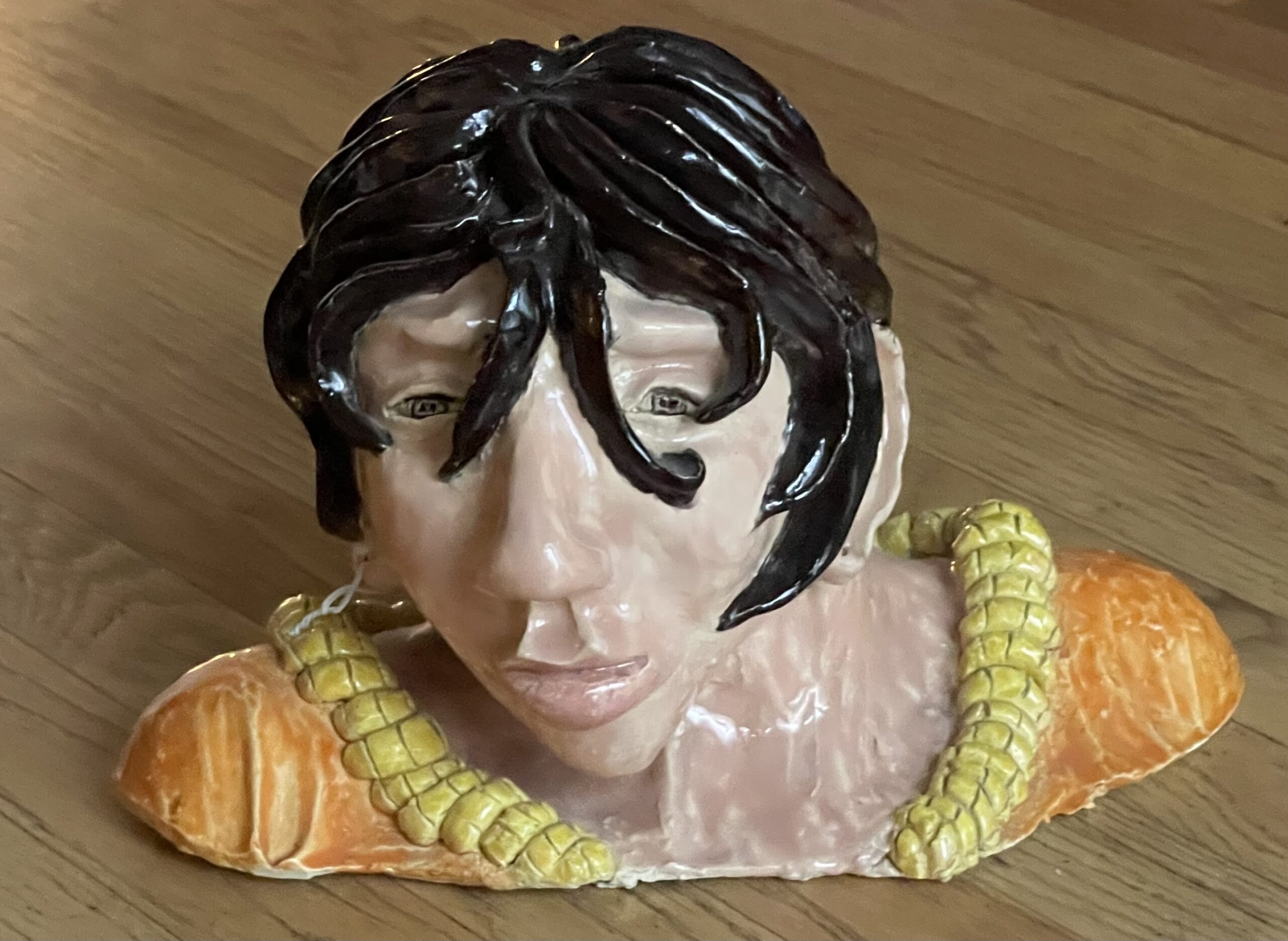 Chad, a plaster head of guy with brown hair hanging in his eyes and seashell neckless 9’ H X 12” W